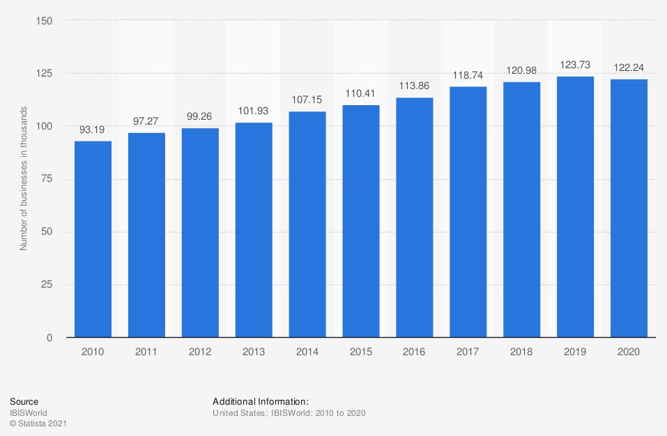 Number of businesses in the catering sector in the United States from 2010 to 2020 (in thousands)