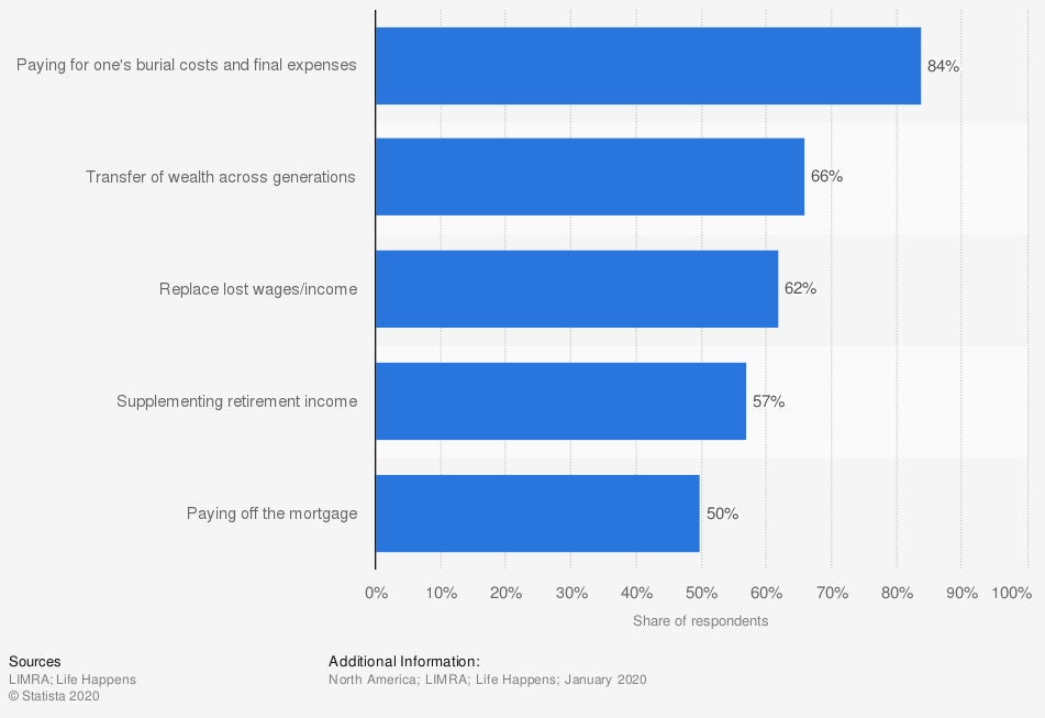 84% of people said they purchased life insurance to pay for burial cost and final expenses. 57% said their life insurance policy was for supplementing retirement income.