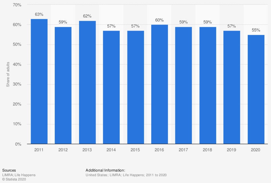 Share of adults who owned life insurance in the United States from 2011 to 2020